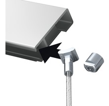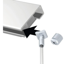 Möchten Sie Bilder flexibel an schrägen Wänden oder Decken aufhängen? Dann bieten die schrägen Stopper in Kombination mit einem Aufhängesystem für Bilder die Lösung. Die Aufhängeschnur mit Haken lässt sich mühelos in die Schiene schieben. Der Stopper wird mit dem Inbusschlüssel an der gewünschten Position in der Schiene gesichert.