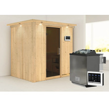 Elementsauna Karibu Bodina inkl. 9 kW Bio Ofen u.ext.Steuerung mit Dachkranz und graphitfarbeneer Ganzglastüre