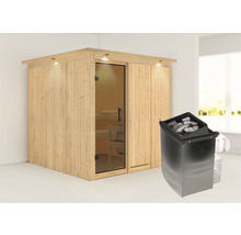 Elementsauna Karibu Rodina inkl. 9 kW Ofen u.integr.Steuerung mit Dachkranz und graphitfarbeneer Ganzglastüre
