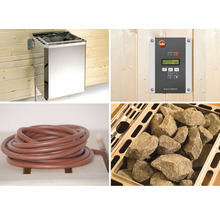 - Optionales ZubehörOfenset 2, Ofenset 3, Ofenset 6, Ofenset 7, Ofenset 10, Saunaleuchtenset, Saunaleuchtenset, Saunahandtücher, Klimamesser, Tauchbottich, Massagebürste, Sauna-Zubehör-Set 5-tlg.