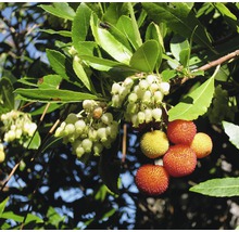 Sehr attraktiver, immergrüner Strauch mit erdbeerähnlichen Früchten. Weisse Glöckchenblüten im Herbst, zeitgleich knallrote, runde, reife Beeren (bis 2 cm Durchmesser, weisses, süssliches Fruchtfleisch). Zum Frisch-essen, für Marmeladen, Likör. Eingewachsene Pflanze winterhart bis – 10° C (kurzzeitig), ansonsten Winterschutz geben. Als Kübelpflanze oder in winter-milden Regionen geschützt auspflanzen, halbschattig bis vollsonnig in durchlässigen Böden. Langsam wachsend, bis 2 – 3 m hoch, selbstfruchtbar. Robust.