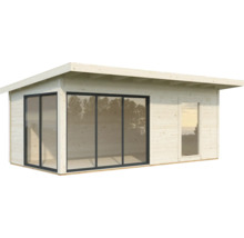Unaufgeregt schlicht und dabei ungemein attraktiv kommt das massive Palmako Pultdach-Gartenhaus Andrea 17,1 m² daher. Modern und gleichzeitig zeitlos im Design strahlt Andrea Eleganz und Klasse aus. Entspannen Sie im lichtdurchfluteten Raum und lassen Sie die Seele baumeln oder feiern Sie ausgelassene Partys mit Freunden, dank der großen Panorama-Schiebetüren kann die Partyzone bei schönem Wetter problemlos nach draußen erweitert werden. Durch das zusätzliche Langfenster kommt eine angenehme luftig-leichte Atmosphäre in den Raum. Das Haus wird aus transparent tauchgrundiertem, nordischen Fichtenholz gefertigt und verfügt über 44 mm starke Doppelnut- und Feder Bohlen. Die Schiebetüren sind mit einem Profilzylinder Schloss sowie einer 4 mm ESG Verglasung ausgestattet, das Langfenster ist isolierverglast. Andrea verfügt über ein 80 cm tiefes Vordach und einen stabilen 19 mm starken Fussboden. Ein Montageset ist ebenfalls im Lieferumfang enthalten. Dacheindeckung und ein Regenrinnenset sind optional erhältlich. Das Haus kann spiegelverkehrt aufgebaut werden.