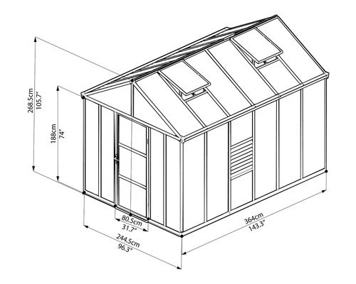 - Hohe Stehhöhe (262 cm) und hohe Traufe (186,5 cm) sorgen für einen grossen Innenraum und reichlich Platz zum Aufstellen von hohen und blattreichen Pflanzen