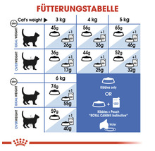 - FütterungshinweisModerater Kaloriengehalt<br />Der moderate Energiegehalt und die Zufuhr von L-Carnitin (50mg/kg)<br />helfen einer Gewichtszunahme vorzubeugen., Kontrollierte Haarballenbildung<br />Die Kombination von verdaulichen und unverdaulichen Fasern<br />kann zur Stimulierung der Darmmotorik und zur Ausscheidung von<br />abgeschluckten Haaren beitragen., Kann helfen, die Harnwegsfunktionen der erwachsenen<br />Katze zu unterstützen, "IDEAL WEIGHT:<br />3kg: 45g, 4kg: 56g, 5kg: 65g, 6kg: 74g<br />OVER WEIGHT:<br />3kg: 36g, 4kg: 44g, 5kg: 52g, 6kg: 59g<br /><br />Mischfütterung:<br /><br />IDEAL WEIGHT:<br />3kg: 26g + 1 Pouch, 4kg: 36g + 1 Pouch, 5kg: 46g + 1 Pouch, 6kg: 55g + 1 Pouch<br />OVER WEIGHT:<br />3kg: 17g + 1 Pouch, 4kg: 25g + 1 Pouch, 5kg: 32g + 1 Pouch, 6kg: 40g + 1 Pouch"