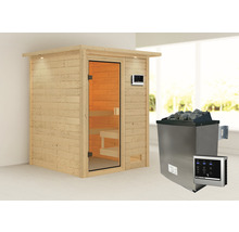 Massivholzsauna Karibu Sandra inkl.9 kW Ofen u.ext.Steuerung mit Dachkranz und bronzierter Ganzglastüre