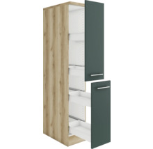 Darum solltest Du zugreifen: Der Optifit Apothekerschrank Savona in Grün Matt bietet dank seiner Höhe von 174,4 cm und einer Breite von 30 cm viel Stauraum, ohne viel Platz in Anspruch zu nehmen. Die zwei Auszüge erleichtern den Zugriff auf Lebensmittel und Kochutensilien, wodurch Ordnung und Übersichtlichkeit in der Küche gewährleistet sind. Die grüne Frontfarbe in Kombination mit der Korpusfarbe Wildeiche verleiht Deiner Küche einen modernen, natürlichen Look. Dank der zerlegten Montageart lässt sich der Schrank bequem transportieren und flexibel in der Küche aufbauen. Die mattierte Oberfläche der Front sorgt für eine elegante und pflegeleichte Optik, wodurch Fingerabdrücke und leichte Verschmutzungen weniger auffallen.