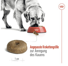 Die besondere Grösse und Form unserer Kroketten berücksichtigen die ausgeprägte Kieferform Ihres älteren Hundes und sorgen dafür, dass er seine Nahrung richtig kaut.