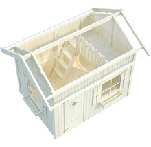 Das Palmako Spielhaus Grete aus unbehandeltem nordischem Fichtenholz bietet mit einer Grösse von ca. 3,7 m² den perfekten Rückzugsort für Ihre Kinder. Sie können dort in Ruhe allein oder zusammen mit anderen Kindern spielen und sind gleichzeitig vor Regen und Sonne geschützt. Nach langem Spielen können sich Ihre Kinder dank des integrierten Schlafbodens in diesem Haus sogar ausruhen. Das Spielhaus besteht aus vorgefertigten Wandelementen, die die Montage vereinfachen. Es verfügt neben dem praktischen Schlafboden auch über einen aufgesetzten Schornstein, Blumenkästen sowie drei Fenster aus Acrylglas mit angedeuteten Fensterläden. Die Dach- und Fussbodenbretter und das Montagezubehör sind bereits inklusive. Versehen Sie die Fassade des Spielhaus mit einem farbigen Anstrich und schützen damit das Holz gegen Witterungseinflüsse. Grundieren Sie dazu die Fassade und bringen anschliessend einen Anstrich nach Ihrer Wahl auf. Insgesamt hat das Spielhaus die folgenden Masse (H x B x T): 220 cm x 258 cm x 223 cm. Die Benutzung wird für Kinder ab drei Jahren unter unmittelbarer Aufsicht von Erwachsenen empfohlen. Nur für den Hausgebrauch im Freien vorgesehen. Durchgangsmass Fenster: 59 cm x 59 cm / Durchgangsmass Tür: 58 x 130 cm / Grundfläche: ca. 3,7 m². Bei allem Spass, den Ihre Kinder beim Spielen im Kinder Gartenhaus haben werden, steht die Sicherheit und Unversehrtheit der Kinder im Vordergrund! Das Palmako Spielhaus ist TÜV-Rheinland-zertifiziert, sodass Sie sich um die Sicherheit Ihrer Kinder keinerlei Sorgen machen müssen. Die Fenster des Hauses bestehen aus Acrylglas, wodurch das Verletzungsrisiko so gering wie möglich gehalten wird. Lieferumfang: Spielhaus inkl. Dach- und Fussbodenbretter mit Nut und Feder, Einzeltür, Einzelfenster mit Acrylglas, Montagezubehör