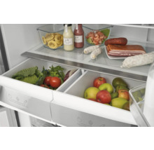 Grosszügiger Kühlraum mit 329 Liter und 163 Liter Gefrierabteilung. Praktisches Bedienpanel an der Aussenseite für manuelle Temperatursteuerung. No Frost und Multi-Air Flow Technologie sorgt für optimale Feuchtigkeit. Fächer für Obst und Gemüse sowie Fisch und Fleisch für längere Frische. Viel Platz und trotzdem alles im Blick, dank ausziehbarer Tablare.