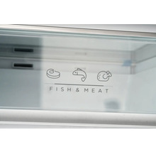 Türschliess-Assistenz verhindert Energieverlust aufgrund offenstehender Türen. Fächer für Obst und Gemüse sowie Fisch und Fleisch für längere Frische. Viel Platz und trotzdem alles im Blick, dank ausziehbarer Tablare.