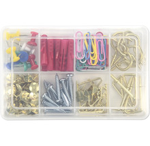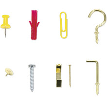 - Set bestehend aus30 Stk. Papierclips (farbig) 28 mm, 62 Stk. Haken (Messing überzogen), 10 Stk. Steckstifte (farbig), 12 Stk. PE-Wandstecker 6mm (rot), 12 Stk. Blechschrauben (verzinkt, 4,2x25mm), 8 Stk. Haken (messingbeschichtet, 2,5x25mm), 8 Stk. Vierkanthaken, (messingbeschichtet, 2,5x25mm), 8 Stk. Bildaufhänger (Messing, 20 mit Nagel)
