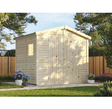 L'abri à outils Palmako Dan 4,5 m² en bois d'épicéa du Nord séduit par son aspect compact et offre un espace de rangement supplémentaire pour la tondeuse et les autres appareils de jardinage même dans les petits jardins. Les éléments de cloison préfabriqués (épaisseur de madriers 16 mm) permettent un montage facile. Porte à deux vantaux sans découpe, fenêtre à un vantail fixe avec plexiglas. Le toit et le plancher sont constitués de planches rainure et languette de 16 mm d'épaisseur. Le carton bitumé, les bardeaux et la couverture de toit SBS peuvent être commandés en option. En usine, la maison est doté d'une façade colorée dans la teinte gris clair RAL7042. L'intérieur reste à l'état naturel.