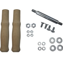 - RemarqueSet composé de : 2 x poignées en bois, 4 x vis à tête fraisée M8x23, 4 x rondelles en U M8, 4 x écrous M8, 1 x axe à visser 17 mm avec un filetage M12, 2 x écrous M12, 4 x rondelles en U M12