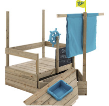 Ohé, les marins ! Prêt pour une aventure maritime ? Alors ce bateau de jeu en bois avec bac à sable intégré est exactement ce qu'il faut à vos enfants.Le clou : le bateau de jeu pour enfants en pin européen 100% certifié FSC dispose de deux modes de jeu. Il suffit de retirer le bateau de jeu pour que le bac à sable intégré soit prêt à jouer. Après avoir joué, il suffit de le repousser pour que le bac à sable ne se salisse pas. Autre avantage : en mode compact peu encombrant, le bateau en bois est également idéal pour les jardins ou les terrasses où l'espace est limité. Plus : sous la surface de jeu en bois à la proue du bateau se cache en outre un espace de rangement pratique pour toutes sortes de jouets.De plus, le bateau de jeu en bois est équipé de détails amusants qui amusent et invitent à jouer avec fantaisie : La roue de capitaine avec des détails de boussole, un tableau à craie pour dessiner, un bol à eau amovible et une voile résistante aux UV offrent de nombreuses possibilités de jeu et rendent l'aventure du marin parfaite.Convient aux enfants à partir de 3 ans. Caractéristiques:Fabriqué en pin européen 100% certifié FSCBateau de jeu en bois multifonctionnel avec de nombreuses possibilités de jeuDeux modes de jeu avec bac à sable extensibleMode compact peu encombrantInclus une roue de capitaine, des détails de boussole, un tableau noir intégré, un bol de boue amovible, une voile et un espace de rangement sous la surface de jeuConvient aux enfants à partir de 3 ans