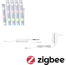 Les bandes MaxLED 250 avec 9 W créent une lumière décorative agréable et sont contrôlables intelligemment grâce à la fonction Zigbee intégrée. Grâce à la fonction de changement de couleur, vous créez une ambiance totalement individuelle; depuis l'éclairage permanent monochrome jusqu'aux effets lumineux multicolores, tout est possible. Une diode blanche (W) permet également un éclairage blanc chaud confortable et rend inutile le mélange du ton de blanc à partir des couleurs rouge, vert et bleu (RVB). Le kit de base contient, outre les bandes avec revêtement (Protect Cover) d'une longueur de 1,5 m, un régulateur de puissance adapté et un contrôleur Zigbee qui permet de le contrôler de façon intelligente. Zigbee est un protocole de transmission radio qui permet de connecter des appareils de différents fabricants. Le régulateur de puissance contient un tampon de puissance supplémentaire, ce qui permet de l'étendre sans outils avec des bandes supplémentaires selon les besoins. Les bandes MaxLED sont de véritables éléments phares en particulier dans les profils. Paulmann propose également un vaste assortiment de profils de montage en saillie et encastré adaptés aux bandes MaxLED.