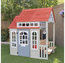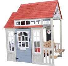 Cette cabane de jeux a un design moderne avec un toit en bois à deux étages et des fenêtres verticales. Avec de nombreux extras comme la cuisine avec boutons interactifs, le sac suspendu pour ranger les jouets, la boîte aux lettres et le tableau mural.