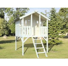 Cabane de jeux pour enfants composée d'éléments muraux préfabriqués sur pilotis de 118 cm - escalier inclus- avec terrasse couverte et fermée, avec 2 fenêtres en plexiglas et croisillons en applique sur le devant. Certifiée TÜV selon les normes européennes EN 71-1, EN 71-8 et les directives 2009/48/CE du Parlement européen et du Conseil européen.