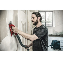 C'est une occasion à ne pas manquer: lorsque le mur n'est pas encore lisse et qu'il doit encore être enduit, il faut sortir un outil de ponçage. La poignée de l'appareil est également un tuyau qui conduit sur une des extrémités au plateau de ponçage et sur l'autre à un raccordement d'aspirateur.