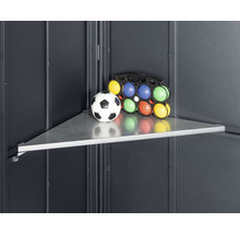 Étagère d'angle EcoStar L'étagère d'angle EcoStar permet d'équiper toutes les remises à outils EcoStar d'une zone de dépose confortable. La tablette triangulaire galvanisée à chaud s'accroche très facilement. Vous pouvez sélectionner l'angle dans lequel vous souhaitez la placer, en sachant que 2 tablettes d'angle au maximum peuvent être placées par angle.