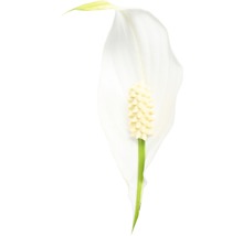 Ses fleurs blanches ont la fome de cuillères. La fleur blanche se tient droite. Le Spathiphyllum a un fort pouvoir de purification de l'air.
