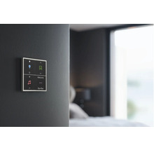 Lorsqu'on appuie brièvement sur le bouton-poussoir, les composants souhaités s'allument ou s'éteignent. La fonction variateur des éclairages peut être commandée en appuyant de façon prolongée sur l'interrupteur à bascule. Chaque fonction est dotée de l'icône fonctionnelle correspondante. Dans la version avec module LED, l'icône s'affiche dans la couleur de la fonction en question (par ex. éclairages en bleu, stores vénitiens en vert, multimédias en rouge, scénarios en violet) . La luminosité peut être ajustée selon vos souhaits.