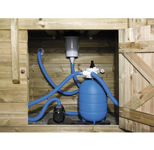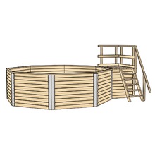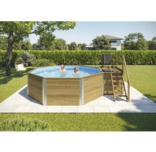 Kit de piscine hors sol en bois Weka 593 B ronde Ø 397x116 cm avec groupe de filtration à sable, skimmer encastré, sable de filtration, tapis intissé de protection du sol et local technique avec escalier en bois et main courante