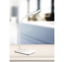 - Contenu dans le matériel fourniLampe de table plastique blanc, chrome, sans fil + chargeur USB, 3 niveaux :3000-4500-6000K, couleurs pouvant être fixées, variateur tactile, LxH :290x560, 1xLED 5W 5V fournie, 250lm