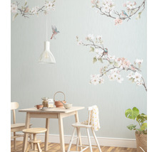 Le motif aux couleurs pastel des fleurs de cerisiers avec deux oiseaux charmants a un effet voluptueux. Les fleurs de cerisiers pénètrent l'image de manière espiègle et la complètent comme une oeuvre d'art stylée pour le mur.