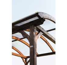 Travail haut de gamme et élaboré. Montants chanfreinés avec appuis à visser, bandeaux ornementés et extrémités de chevrons et de pannes, couverture du toit réalisée à partir de panneaux alvéolés 10 mm en polycarbonate, résistants à la grêle (jusqu'à une taille de grains de 20 mm) en bronze, comprenant matériel de montage.