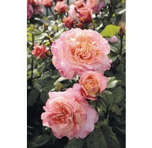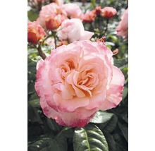 Rosier à grandes fleurs Nostalgie® merveilleux avec des fleurs immenses. La couleur des fleurs varie vigoureusement du rosé à l'abricot, avec une touche de rouge et de jaune. Croissance forte et solide. L'une des meilleurs sortes.