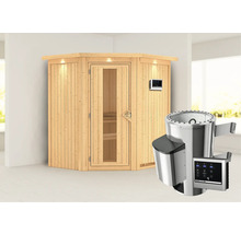 Sauna modulaire Karibu Achat III avec poêle 3,6 kW et commande intégrée, avec couronne et porte bois en verre isolé thermiquement