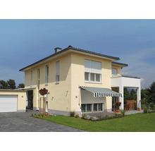 Store banne à bras articulé 3x2,5 tissu rayé vert/blanc piètement RAL 9003 blanc de sécurité