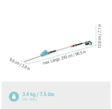 Avec la batterie, la cisaille télescopique pèse 3,4 kg, sa poignée est ergonomique et elle comporte un centre de gravité optimal. Elle tient donc bien en main, même si le manche télescopique est entièrement étiré, lorsque vous voulez profiter de l'intégralité de la portée de trois mètres.