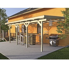 La toiture pour terrasse WEKA offre une grande stabilité et une plus grande sécurité grâce à des raccords à pannes supplémentaires. Le bois de haute qualité est traité en autoclave par imprégnation et, par conséquent, bien protégé contre le vent et les intempéries. Sous la toiture pour terrasse de 215 cm de haut, vous pouvez aménager un endroit accueillant pour goûter la tranquillité, vous réunir entre amis ou partager un barbecue.