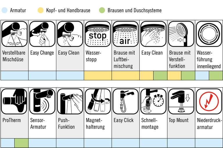 Easy Clean, Schnellmonatge oder Wasserstopp: Verschiedene Symbole zeigen Dir auf einen Blick, welche Funktionen AVITAL Armaturen bieten.