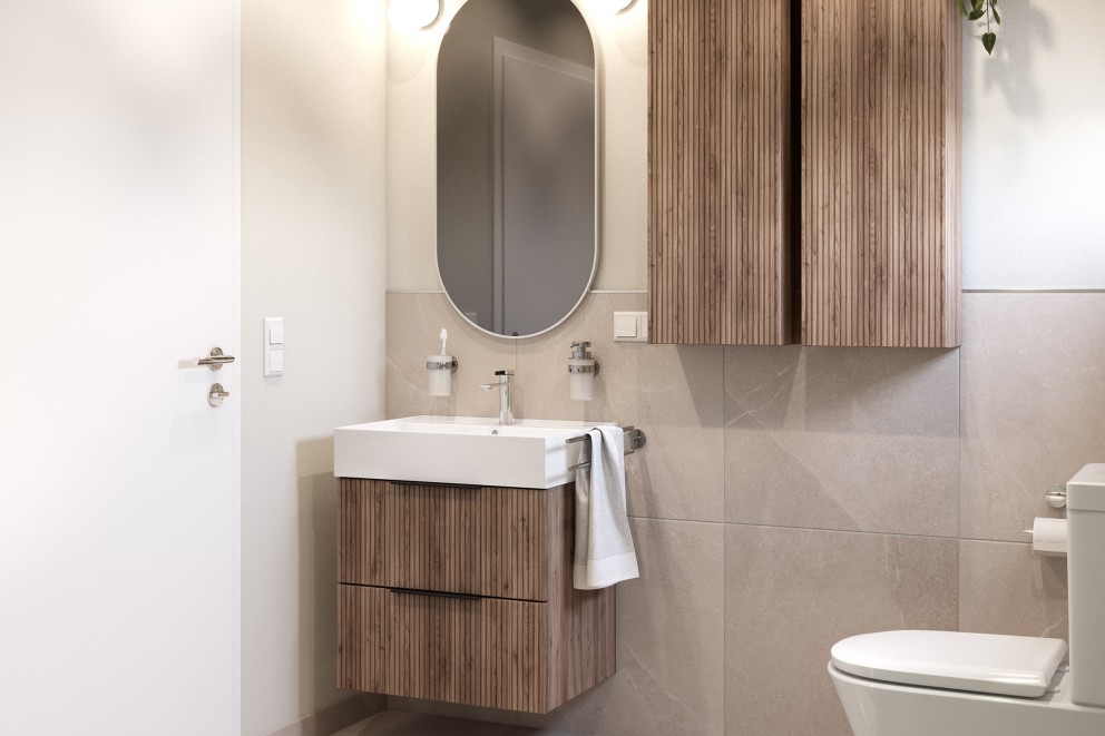 Die elegante Wand- und Bodenfliese der Marke Mirava verleiht dem Duschbad einen besonderen Look. Die komfortable Duschkabine aus Klarglas mit schmutzabweisender Beschichtung ist das Highlight im New Yorker Style, gepaart mit den Jungborn-Armaturen mit spannendem Design in chrom/schwarz. Die Badmöbel in der Farbe nuss matt sehen nicht nur schick aus, sie bieten zudem grosszügig Stauraum auf kleinster Fläche.