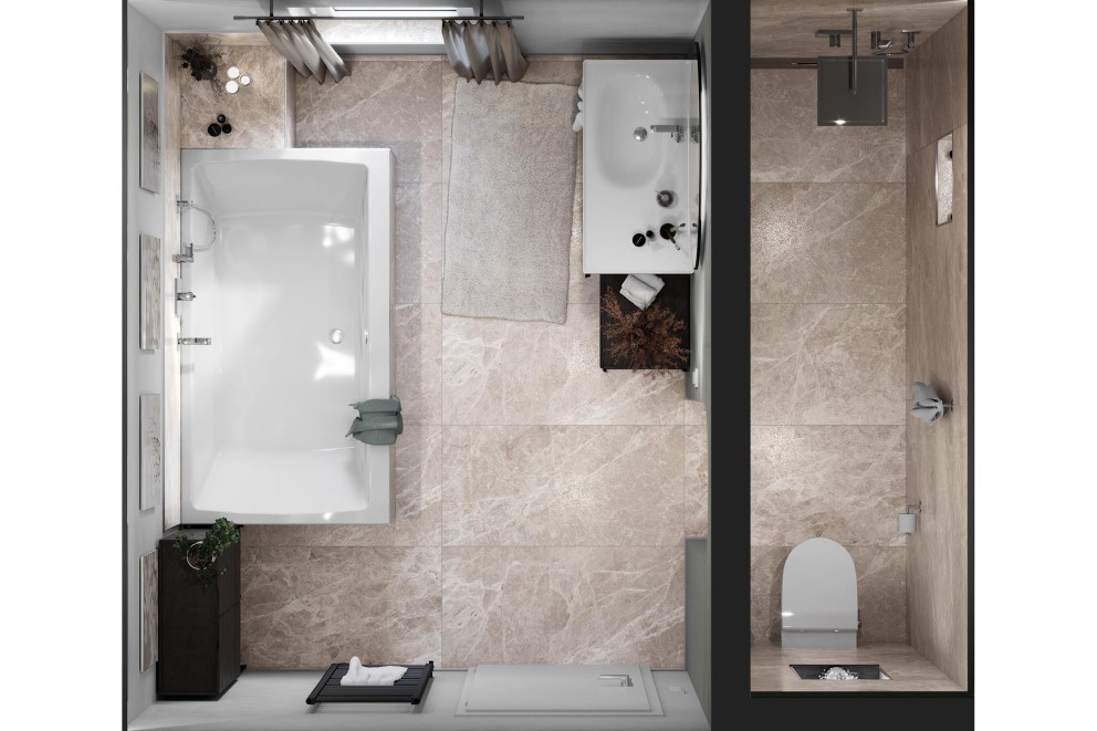 Die Feinsteinzeug-Fliesen in ruhiger Marmor-Optik verleihen dem Bad eine edle Atmosphäre. Die grosszügige Badewanne der Marke Vitra lädt zum Entspannen ein, während der Möbelwaschtisch und die passenden Möbel in Ulme für stilvolle Ordnung sorgen. Abgerundet wird das Konzept durch ein modernes Wand-WC mit integrierter Hygienedusche.