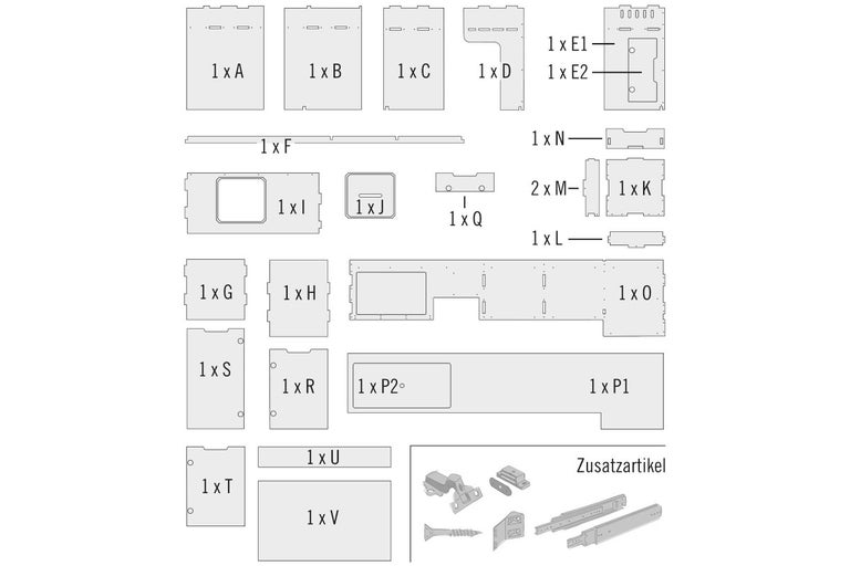 Die Sockelleiste (F) mit den Schlitzen nach oben auf eine ebene Unterlage legen. Die Seitenwände (A) und (E) sowie die Zwischenwände (B), (C) und (D) bereit legen. Zuerst die Seitenwand (E) mit der Nut an der Unterseite am Ende der Fussleiste einstecken. Die Seitenwand bis zum nächsten Arbeitsschritt durch einen Helfer abstützen.