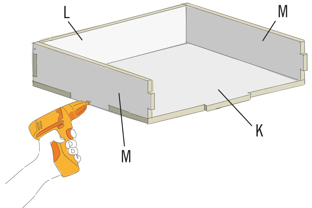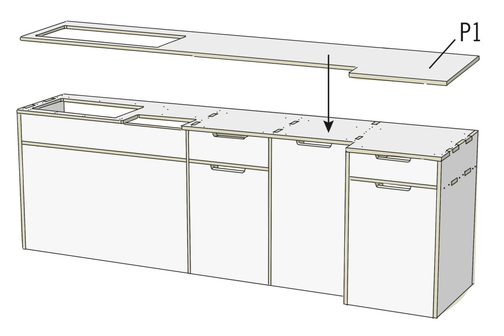 Die Sockelleiste (F) mit den Schlitzen nach oben auf eine ebene Unterlage legen. Die Seitenwände (A) und (E) sowie die Zwischenwände (B), (C) und (D) bereit legen. Zuerst die Seitenwand (E) mit der Nut an der Unterseite am Ende der Fussleiste einstecken. Die Seitenwand bis zum nächsten Arbeitsschritt durch einen Helfer abstützen.
