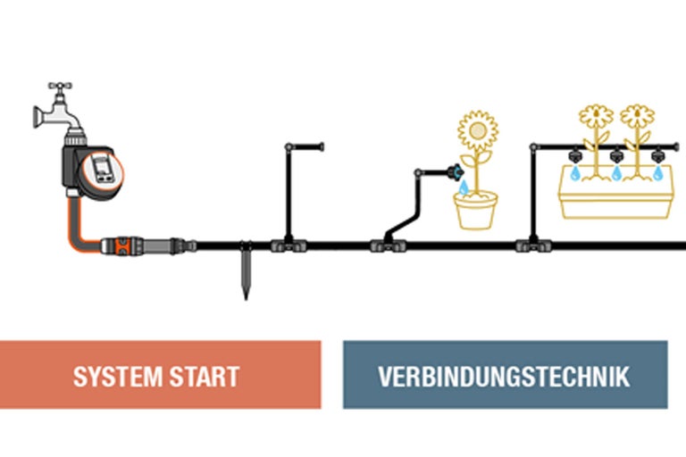 Das smarte Bewässerungssystem verlegst du ganz einfach ohne Vorkenntnisse, dank des Quick & Easy Verbindungszubehörs. Die Tropfbewässerung beginnt mit der Bewässerungssteuerung direkt am Wasserhahn. Von dort fliesst das Wasser zum Basisgerät und erreicht über Tropfrohre und Verbindungsstücke die Pflanzbereiche, wie z. B. Pflanzbeete, Topfpflanzen oder Reihenpflanzen. Dabei verteilen individuell platzierte kleine Tropfer und Sprühdüsen, je nach Bedarf, Tropfen für Tropfen direkt an die Pflanzwurzeln.
