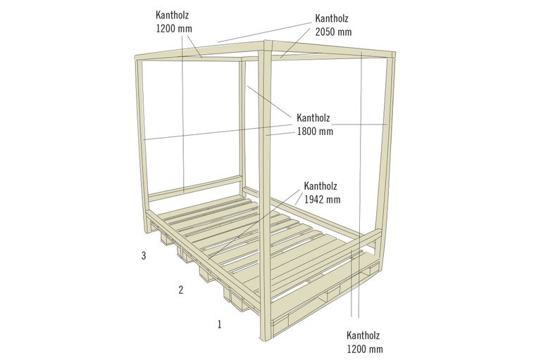 Die beiden Kanthölzer nun an den Bettenden so platzieren, dass die Winkel auf der Palette aufsetzen.