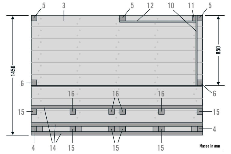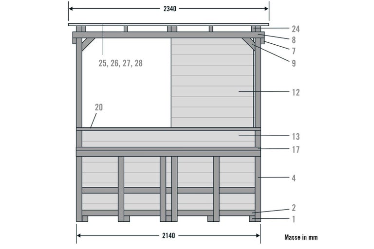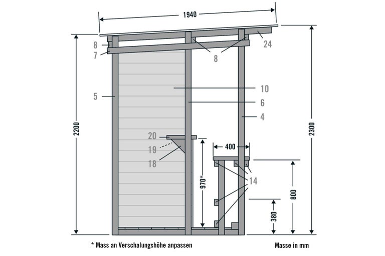 Die Outdoor-Bar wird auf einem Fundament aufgestellt. Geeignet ist z. B. eine 10 cm dicke Fundamentplatte, die ein leichtes Gefälle hat. Auf das Fundament wird der Grundriss aufgezeichnet. Die Markierungslinien stehen im rechten Winkel zueinander, wenn die Diagonalen exakt gleich lang sind.