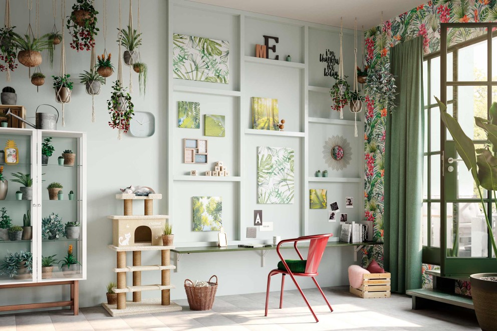 Die einfachste Variante: Streiche Dir eine grüne Wand mit Grüntönen von Moos bis Salbei, so bringst Du Botanik in Deine Bude, ohne zu giessen. Das gilt auch, wenn Du eine Wand als Highlight tapezierst. Botanische oder Dschungelmotive sind modern und ein guter Ersatz für eine echte Pflanzenwand.