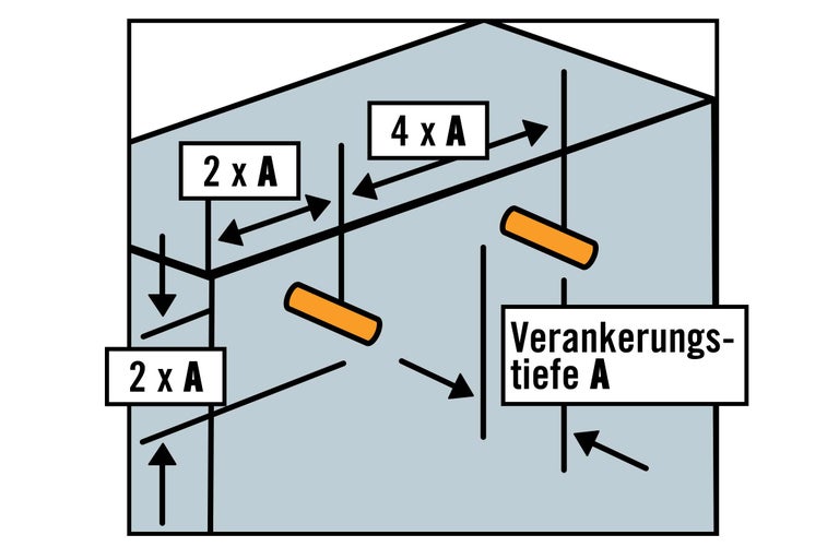 Bei Kunststoffdübeln beträgt der Randabstand üblicherweise die doppelte Verankerungstiefe (= A). Der Achsabstand entspricht der vierfachen Verankerungstiefe.