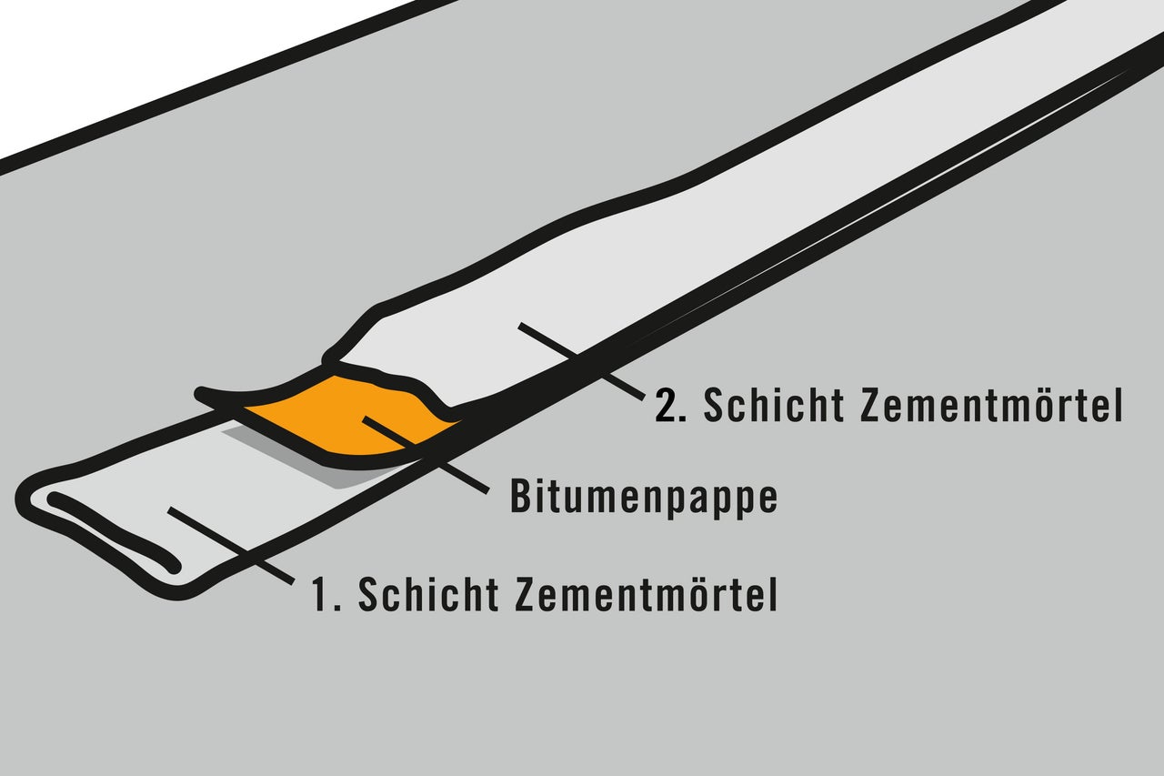 Damit keine Feuchtigkeit ins Mauerwerk aufsteigt, wird eine Sperrschicht unter der ersten Steinreihe benötigt, bestehend aus einer Lage Zementmörtel, einem Streifen Mauersperrbahn und einer weiteren Lage Zementmörtel.