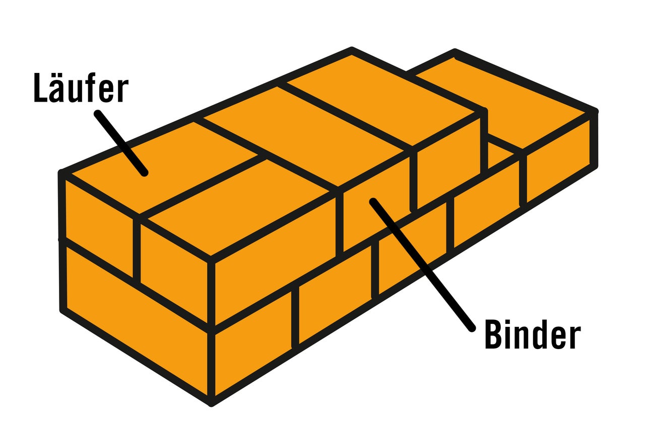 Bei der 36.5-cm-Mauer bestehen alle Schichten aus Läufern und Bindern. Von Schicht zu Schicht liegen an der Sichtseite einmal die Läufer und einmal die Binder.