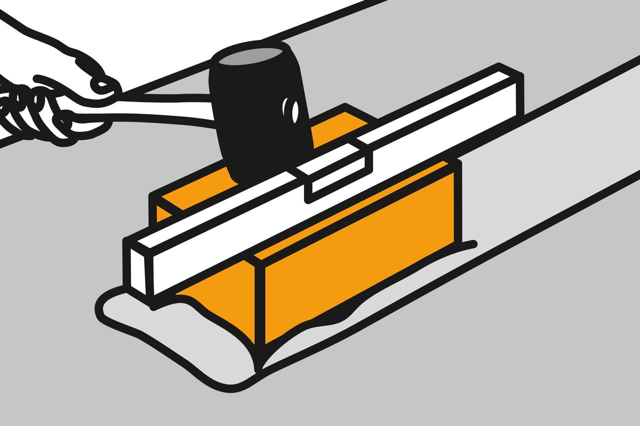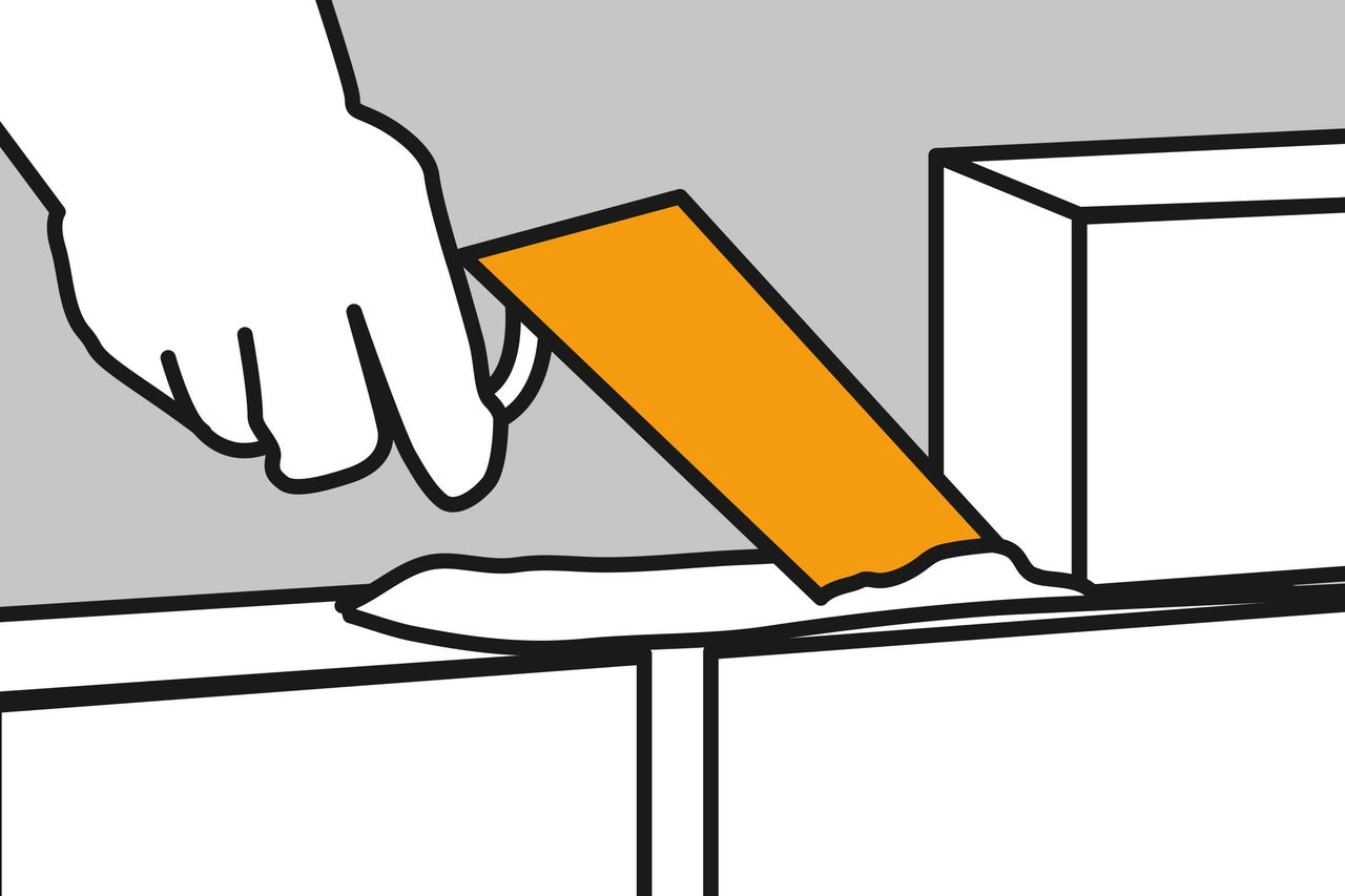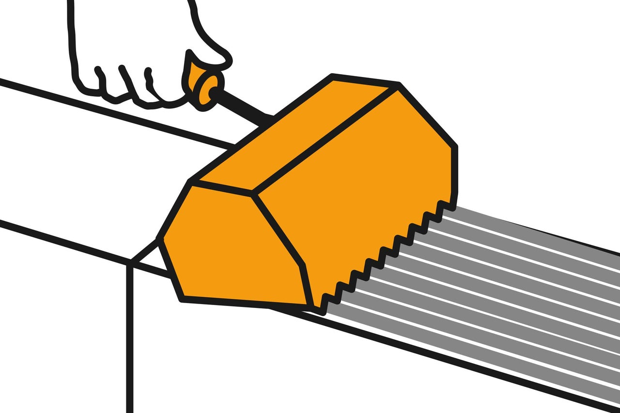Das Verkleben erfolgt mit Dünnbettmörtel, der mit Wasser zur gebrauchsfertigen Masse angerührt wird. Trage den Kleber mit einer Plansteinkelle auf. Zum weiteren speziellen Werkzeug dieses Systems gehört das Schleifbrett. Mit ihm werden Unebenheiten im Steinverlauf bei jeder neuen Lage beseitigt, bevor weitergearbeitet wird.