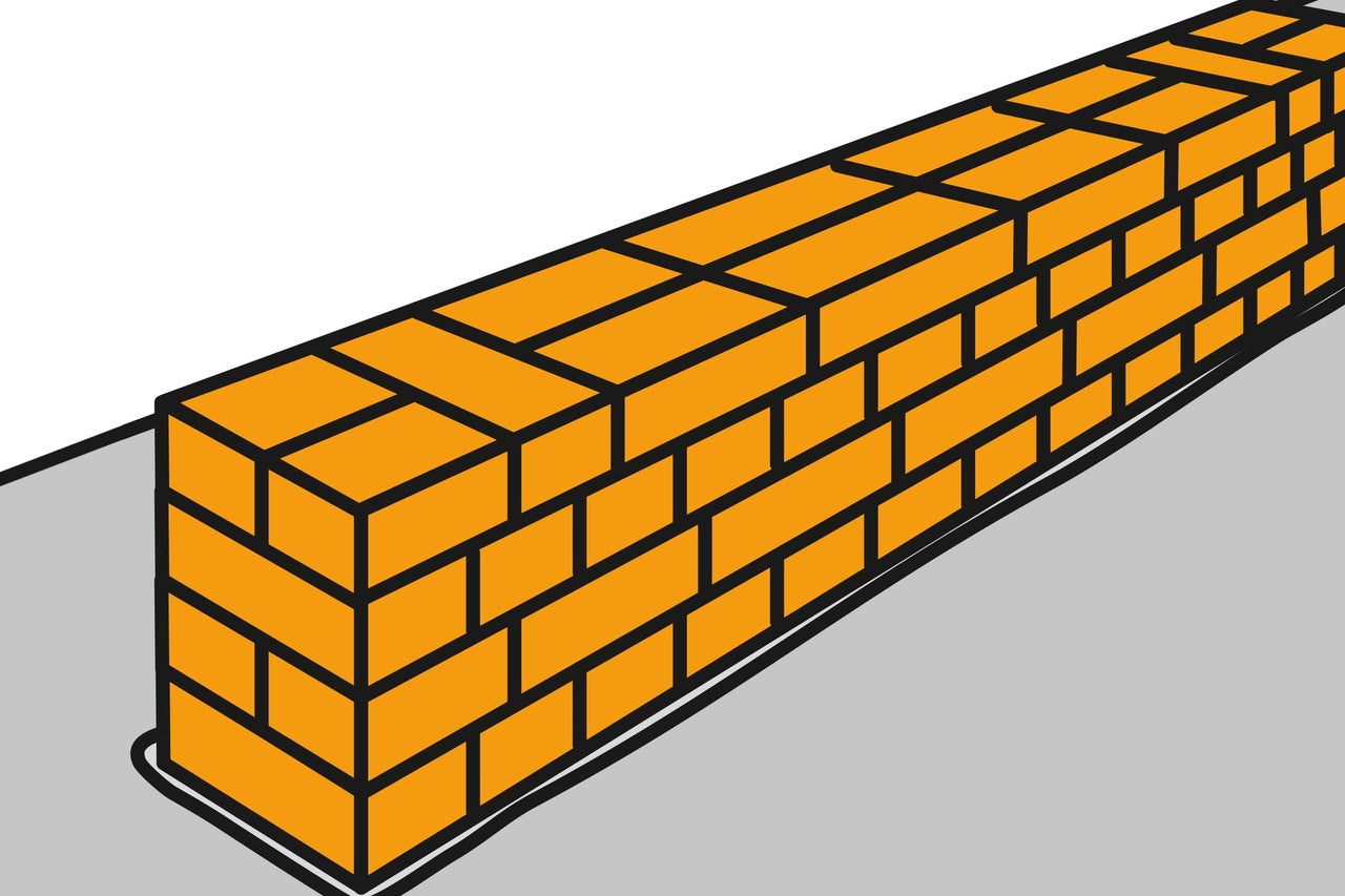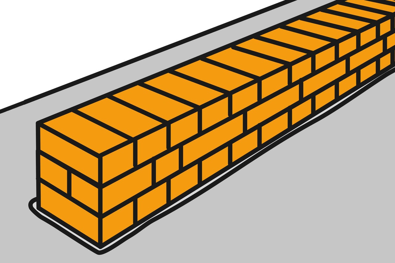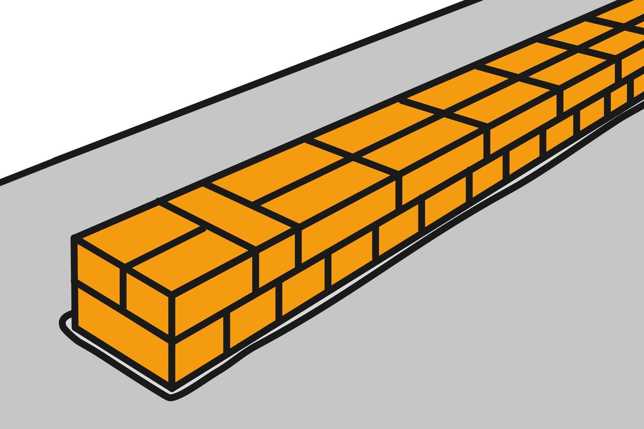 Damit keine Feuchtigkeit ins Mauerwerk aufsteigt, wird eine Sperrschicht unter der ersten Steinreihe, bestehend aus einer Lage Zementmörtel, einem Streifen Mauersperrbahn und einer weiteren Lage Zementmörtel benötigt. Bei der ersten Steinreihe ist ein dickes Mörtelbett zum genauen Ausrichten erforderlich. Setze den ersten Stein ins Mörtelbett und richte ihn genau aus.