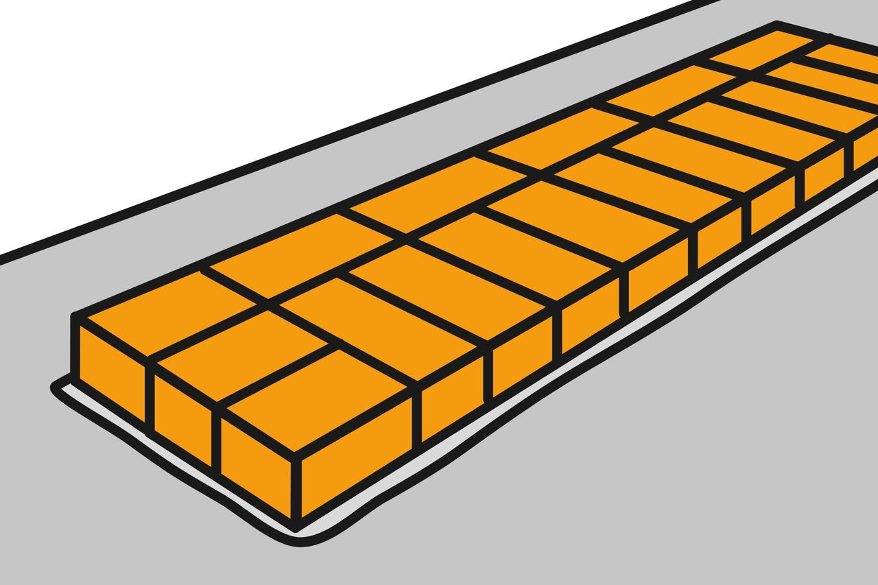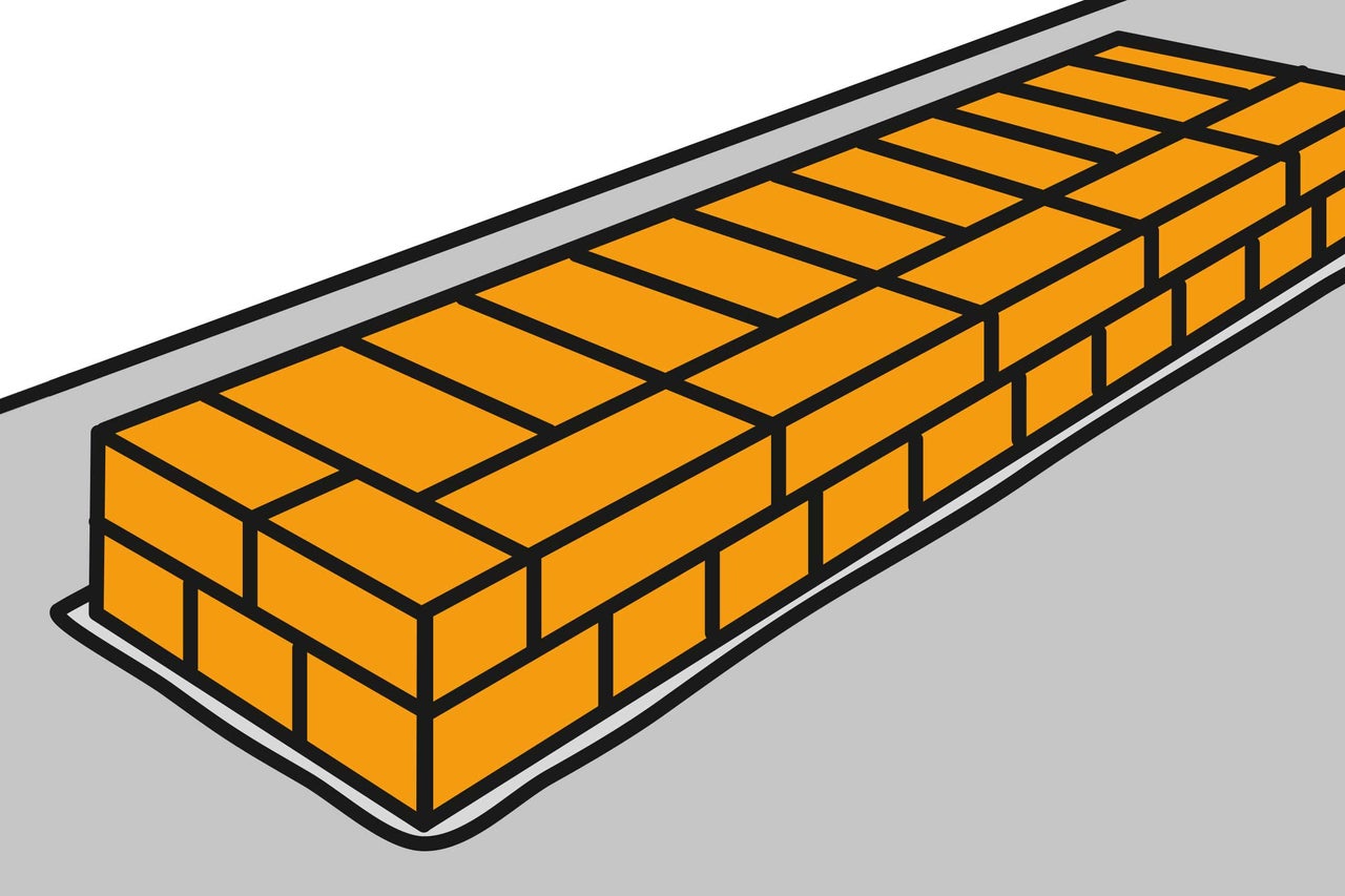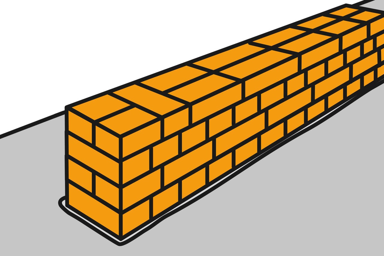 Damit keine Feuchtigkeit ins Mauerwerk aufsteigt, wird eine Sperrschicht unter der ersten Steinreihe, bestehend aus einer Lage Zementmörtel, einem Streifen Mauersperrbahn und einer weiteren Lage Zementmörtel benötigt. Bei der ersten Steinreihe ist ein dickes Mörtelbett zum genauen Ausrichten erforderlich. Setze den ersten Stein ins Mörtelbett und richte ihn genau aus.