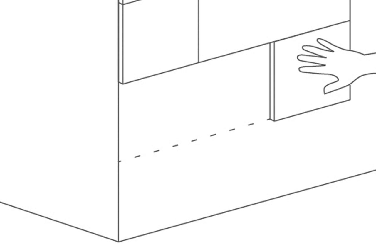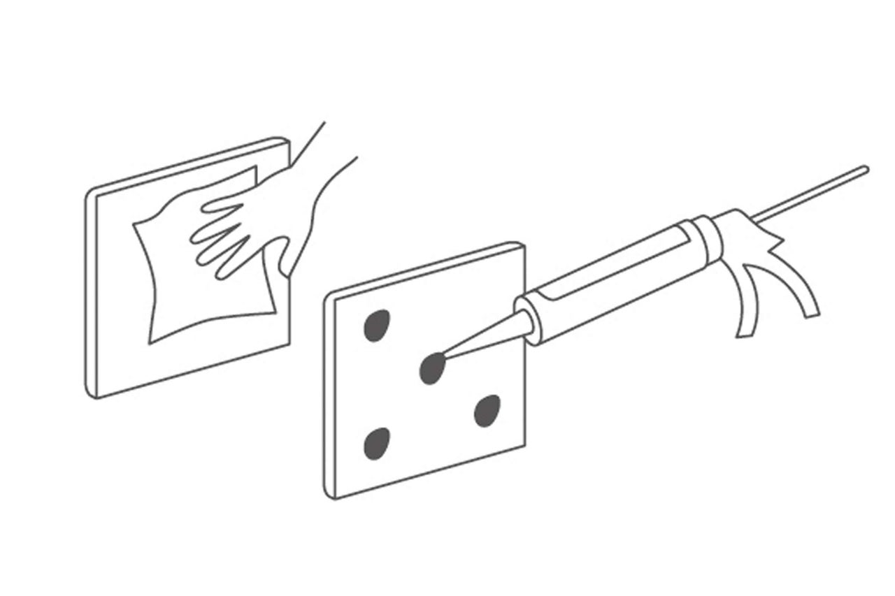 Du kannst auch Montagekleber verwenden. Auch hier muss die Rückseite des Paneels sauber, trocken und staubfrei sein. Trage den Kleber an 5 Stellen auf der Rückseite auf.